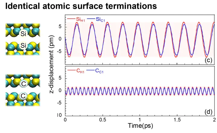 Phonon heat transfer across a vacuum nanogap can be induced by quasi-Casimir coupling without electromagnetic fields. For the thermal energy transport of diatomic molecules, the contribution of the atomic surface termination to the phonon heat transfer across a solid–vacuum–solid nanogap is still not well understood. Here, we investigated the thermal energy transport across a SiC–SiC nanogap with four kinds of atomic surface terminations using classical non-equilibrium molecular dynamics simulations. The thermal resonance between interfacial layers of identical atomic termination results in significant heat transfer enhancement across the SiC–SiC nanogap, while that of non-identical atomic termination is unnoticeable.